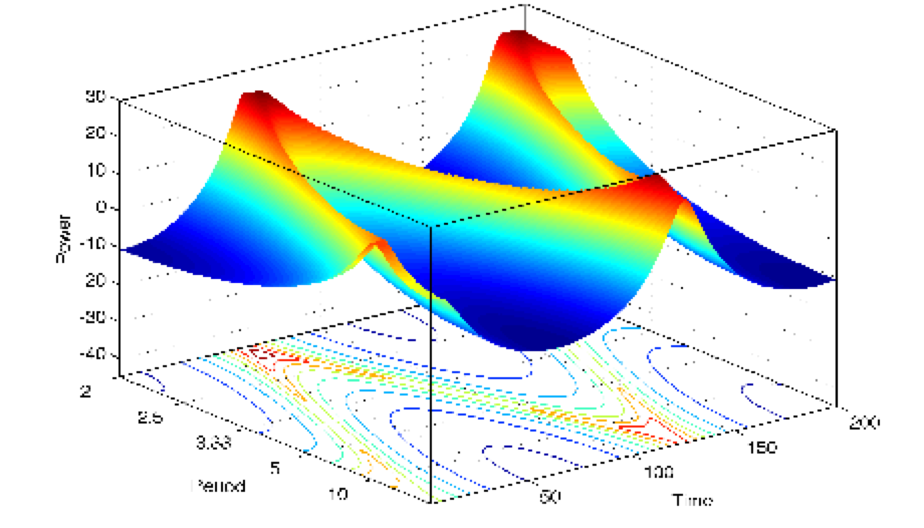 Time-frequency plot produced when the Dynamic (time-variable parameter) Auto-Regression (DAR) routine in CAPTAIN is applied to a ‘chirp’ signal. The analysis is fully automatic and based on the Kalman Filter and Fixed Interval Smoothing algorithms, with the ‘hyper para-meters’ optimized by fitting the model to the Auto-regressive spectrum using maximum likelihood based on prediction error decomposition. The Dynamic Harmonic Regression (DHR) routine provides even greater flexibility and is a very popular tool in CAPTAIN. It can be combined with updated transfer function models to allow for the effects of changes in input variables, as shown in the climate forecasting example discussed briefly on the `Seminars & Papers ‘ page (see above)