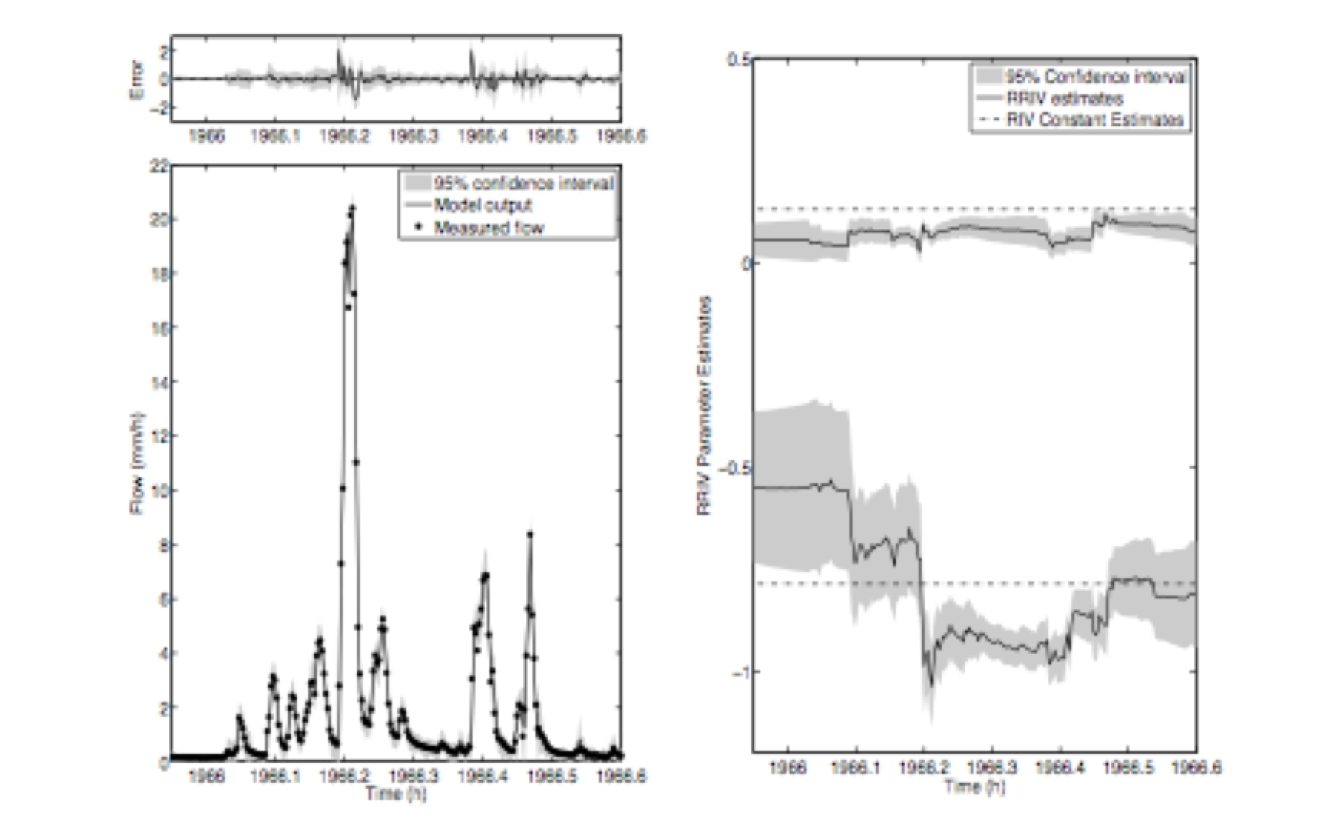 One application of RRIV analysis is for real-time adaptive forecasting of river flow and the RRIV algorithm has been applied to generate one-day-ahead forecasts of flow in the humid Leaf River basin (1944 square km.) located north of Collins, Mississippi, USA. In this case, a rather atypical [1 7 0] TF model is identified between the effective rainfall and flow (see Young, 2012) but the [1 7 1] TF also explains the data quite well and is used for adaptive forecasting because it allows for true, one-day-ahead forecasts. The left panel in Fig.2 shows these forecasts for a short section of the data, with the forecasting error in the upper panel. These forecasts are an immediate output of the RRIV algorithm but the RRIV estimates could be used by a separate Kalman Filter-based forecasting engine. The associated RRIV estimates of the denominator polynomial (bottom) and the most significant numerator parameter (top).