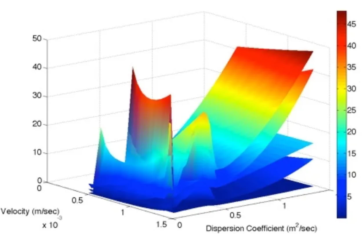 In association with Marco Ratto and Andrea Pagano at the Joint Research Centre of the EEC at Ispra, Italy, we have been developing an approach to the ‘emulation’ a large computer simulation model by a low order DBM-type model. The idea here is either to enhance the DBM modelling procedure before real time series data are available or to build a bridge between a large simulation model based on a hypothetico-deductive strategy and a low order DBM model based on real data and inductive modelling principles (see Young and Ratto, 2009, 2011). There are two types of emulation model, both of which are ‘stand-alone’: i.e. once built, they can operate completely separately to the large simulation model. The first is a ‘nominal emulation’ model that emulates the large model for one set of the large model parameter values; the second is a ‘full emulation’ model that emulates the large model over a whole range of user-specified parameter values. In both cases, emulation is almost always very good, with the low order model closely reproducing over 99.9% of the high order model behaviour. However, synthesis of the the full emulation model requires much greater effort and the ‘mapping’ of the relationship between the large and small model parameter values. A typical map of this kind is shown in the Figure below.